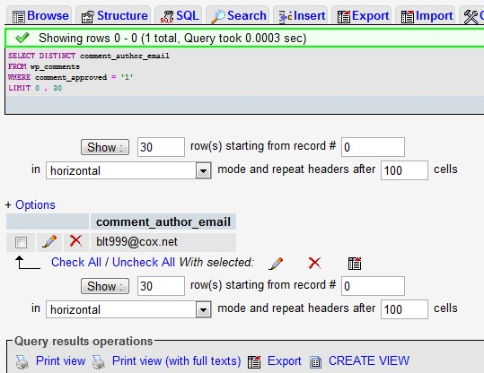 This is a simple way to get a list of all of the email addresses of anyone who has commented on your WordPress blog. Open up phpMyAdmin and select your database. Then click on the Query tab and run this: