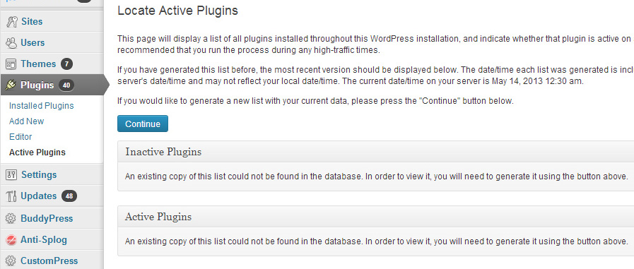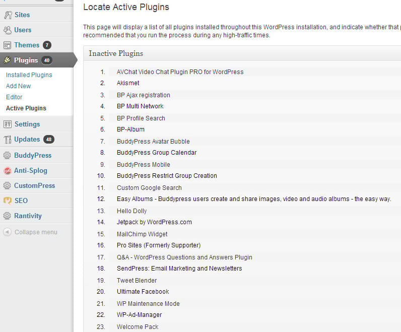 Installing plugins just to try them out and not deleting them is a nasty habit. Sure, you’re in a hurry, but later on you’ll forget why you added those plugins and wonder if you’re really using them. Removing unused plugins is an important part of multisite maintenance. You’ll be able to see issues more clearly when troubleshooting if you have fewer plugins active, minimize security risks and keep your site leaner. Install Plugin Activation Status and it will tell you exactly which plugins you can dump for spring cleaning.