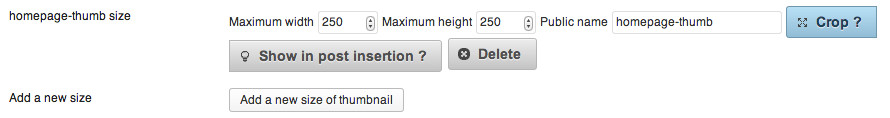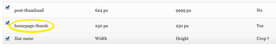 The chances are that you won’t have appropriate image sizes for your post-listing wonderwall. You’ll notice in the code above that I’ve used a size name of homepage-thumb when calling get_the_post_thumbnail, so obviously we need to set this up.