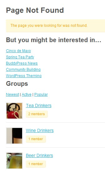 Check out the simple, customized 404 page below. It may not be the most unique 404 page you’ve ever seen but it optimizes the content and promotes the community far better than the standard error message. You’ll be able to use any of the WordPress or BuddyPress widgets available to you when you create the error page.