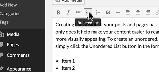 To create an unordered, or bulleted list, simply click the ‘Unordered List’ icon in the formatting toolbar, begin typing the items in your list and when you are finished click the unordered list button again to complete the list.